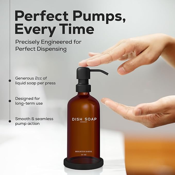 - AMERICAN DESIGN, UNCOMPROMISING QUALITY - Crafted with meticulous attention to detail, our aesthetic glass soap dispenser with pump set features a robust 16oz glass bottle, corrosion-proof 304G stainless steel pump, and a stain-resistant ceramic tray. All designed in the USA to provide unbeatable quality and enduring style that you can trust.