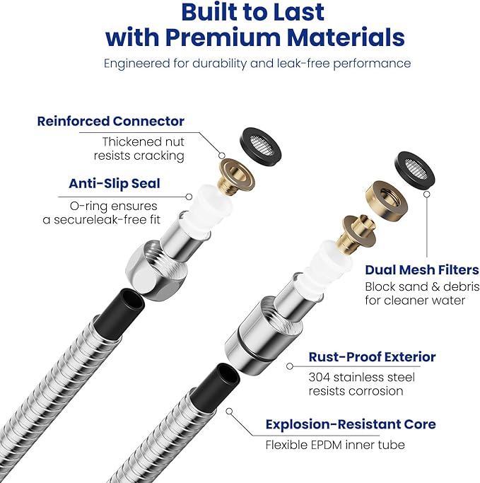 - Built with corrosion-resistant 304 stainless steel outer tubing and solid brass connectors, this shower head hose replacement ensures long-lasting durability and smooth water flow, even under high pressure.