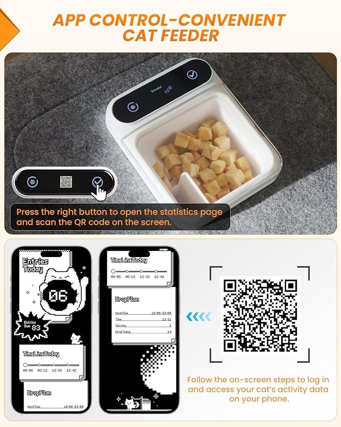 - 【Treat dispenser & grooming record 】Scan the QR Code to Access Cat Entry Data: The treat dispenser base is equipped with sensors that track each cat’s entry and record grooming frequency, giving you easy access to detailed statistics.