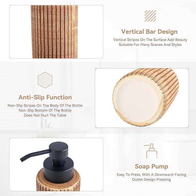 - Ceramic Design: Brown ceramic soap dispenser is made of good quality ceramic, not easy to be damaged, the bottle body is designed with pinstripes, advanced and beautiful modern sense,plastic material pump head smooth liquid discharge.
