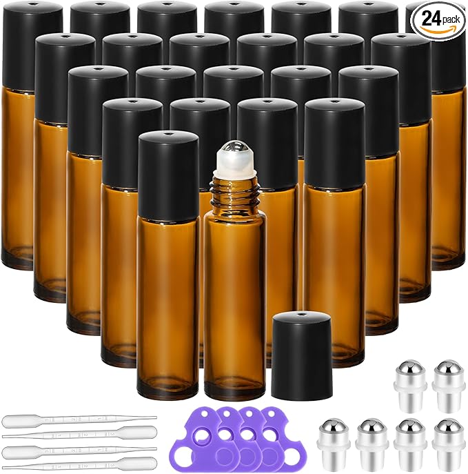 KEYWING 10ml Amber Roller Rottles for Essential Oils - 24PCS Glass Roll on Bottles with Black Caps & Stainless Steel Roller Balls, Empty Perfume Refillable Bottle for Travel