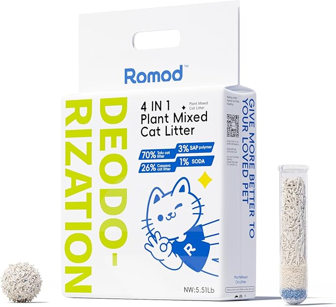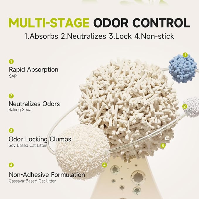 - 4-in-1 Premium Multi-Ingredient - A perfect combination of tofu litter, cassava litter, SAP (super absorbent polymer), and baking soda, offering natural and efficient performance.