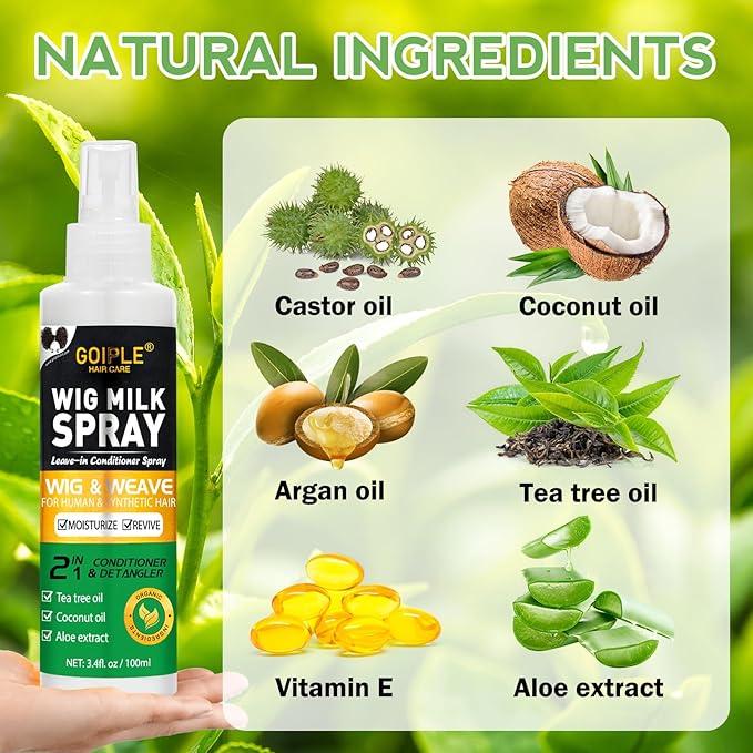 - 2-in-1 Wig Milk Spray: Our innovative wig milk spray combines conditioning and detangling for synthetic hair. Infused with tea tree oil, coconut oil, and aloe essence, it will make your wig more durable