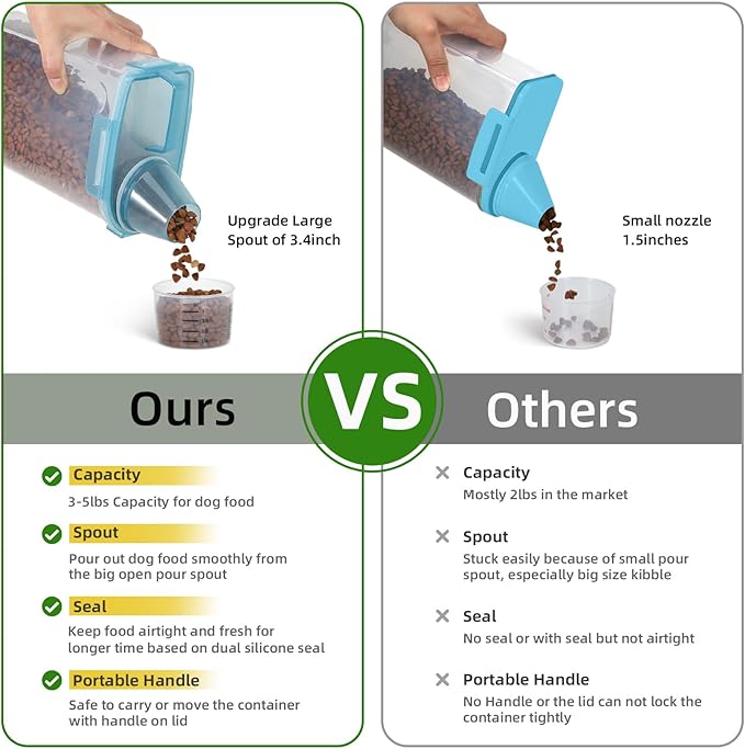 - SUITABLE CAPACITY: The airtight cat food Storage container is designed with a large nozzle, so whether it is small or large pieces of food, it can be easily poured out without shaking the barrel. The handle design makes it easy to use and carry indoors and outdoors. It is also convenient to hold with one hand and tip the bucket to pour out food. The size of the pet food container is 11.8*6.4*4.33 inches, with a capacity of 3 liters. It can store pet food for 3 -5LBS, rice, dry food, cereals, etc. is about 5LBS, depending on the size and shape of the food. Can be easily stored and effectively save valuable space whether indoors, outdoors or during travel.