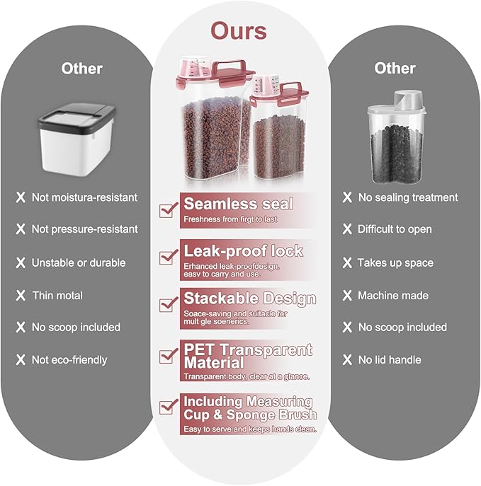 - Airtight Food Container : BPA Free Cat food bins have airtight silicone gasket and 4 snap lock latches to keep out moisture, humidity, and pests.the transparent barrel allows you to clearly see the food inside. It can not only store pet food, but is also a good choice for rice, grains, dry food, flour, brown sugar, and laundry detergent.