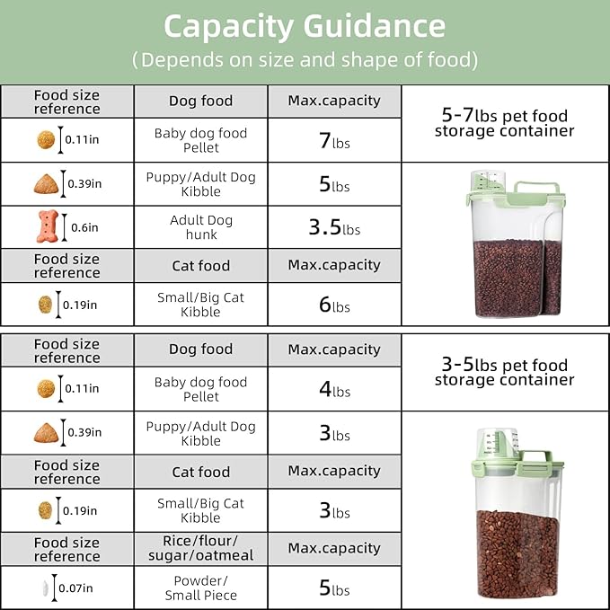 - Pet Food Storage Container : Our Cat Food Storage Container Capacity is 3Qt which can hold about 3lb pet food or 5lb rice. It also works well for regular kitchen food, Such as Dry, flour, cereal, beans, nuts, snack and Pet Treats