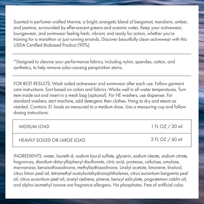 The Laundress Activewear Laundry Detergent, 32 Oz, Marine Fragrance, 4-in-1 Enzyme Blend for Workout Performance Fabrics, Fights Sweat Odors & Stains, USDA Certified Biobased Product (90%)