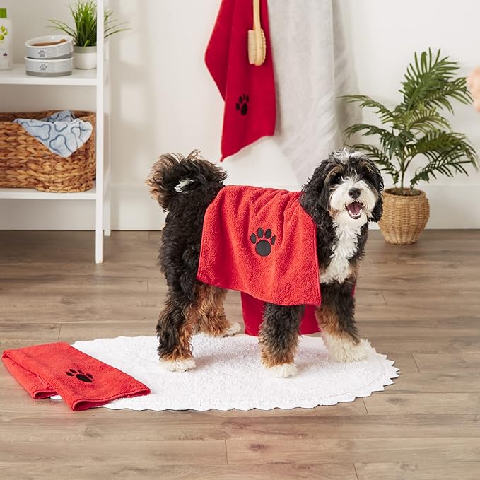Bone Dry Pet Grooming Towel Collection Embroidered Absorbent Microfiber Drying Set, 15x30, Red, 3 Count (Pack of 2)