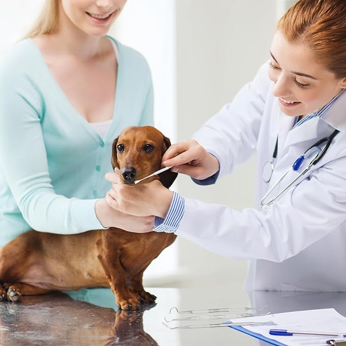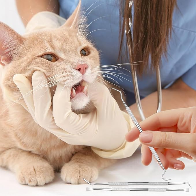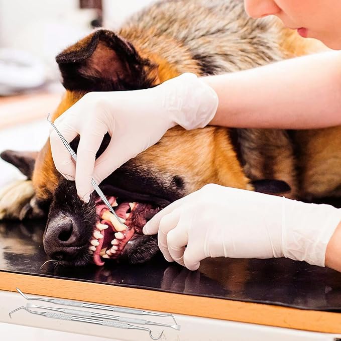- 4-PIECE STAINLESS STEEL PET DENTAL TOOLS SET: Each tool measures 6.5 inches in length and is double-ended, offering a total of 8 functional heads for professional-grade pet dental care. This complete set includes a dental probe, plaque remover, tartar scraper, and sickle scaler—designed to help pet owners effectively clean teeth and maintain oral hygiene for both dogs and cats.