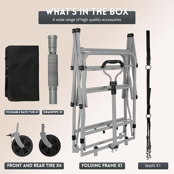 - 4.The package includes everything you need: the bathing platform frame, water storage bag, 4 wheels, drainage pipe, leash, and clear instructions. After one simple, quick assembly, you can enjoy long-term convenience. Thanks to the foldable design, you can easily collapse and store the Dog Stroller-Bath in any corner of the room when not in use.