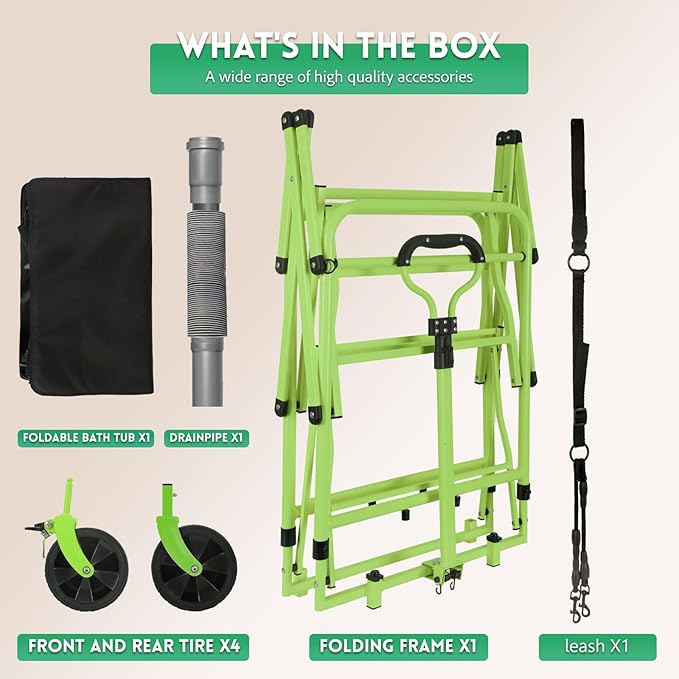 - 4.The package includes everything you need: the bathing platform frame, water storage bag, 4 wheels, drainage pipe, leash, and clear instructions. After one simple, quick assembly, you can enjoy long-term convenience. Thanks to the foldable design, you can easily collapse and store the Dog Stroller-Bath in any corner of the room when not in use.