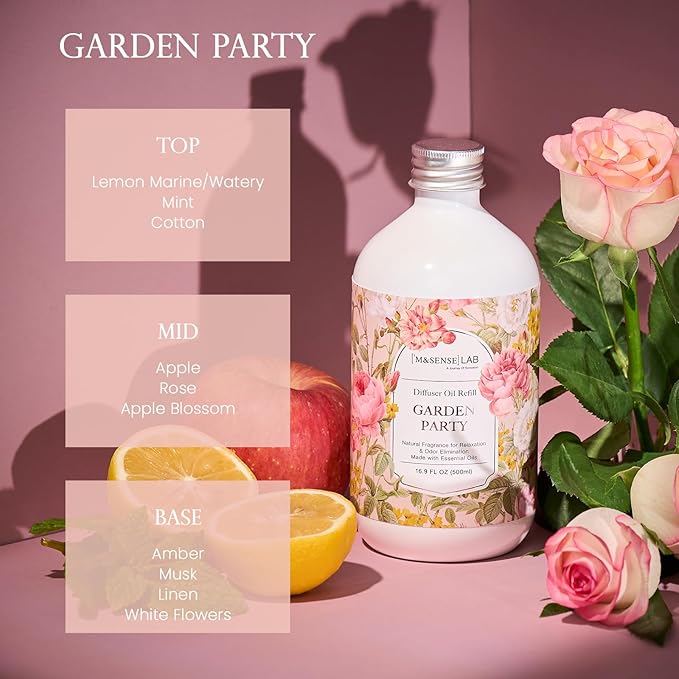 M&SENSE Reed Diffuser Oil Refill, 16.9oz (500ml) with 10 Hollow Reed Sticks, Garden Party Scent Home Fragrance, Scented Oil Refills, Natural Essential Oils for Diffusers, Décor for Home Spa & Office