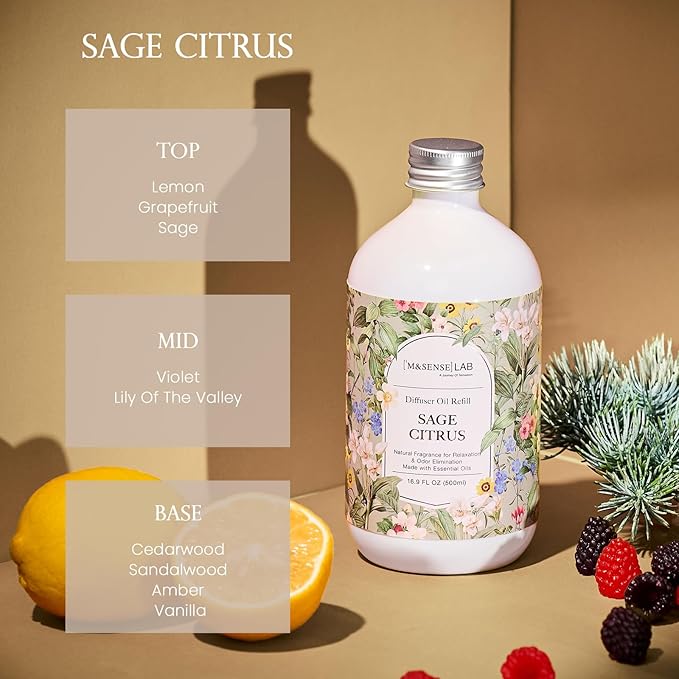 M&SENSE Reed Diffuser Oil Refill, 16.9oz (500ml) with 10 Hollow Reed Sticks, Sage Citrus Scent Home Fragrance, Scented Oil Refills, Natural Essential Oils for Diffusers, Décor for Home Spa & Office