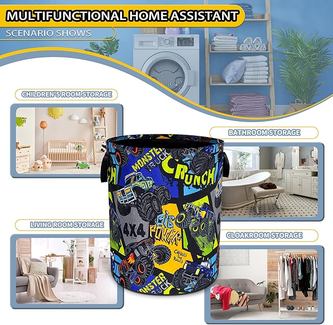 Truck Laundry Basket Big Rig Cartoon Foldable Waterproof Oxford Cloth Funny Tote Bag Laundry Hamper Clothes Storage Bucket Toy Organizer For Bathroom/Laundry Storage/Bedroom 18.9x16.5 Inch