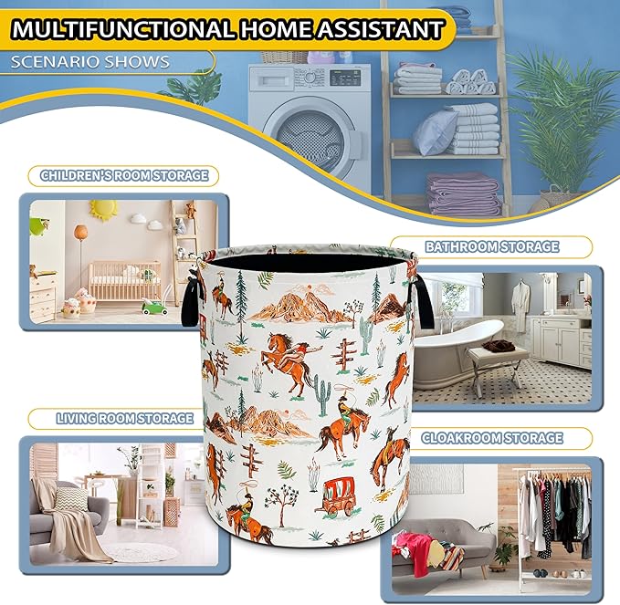 Western Cowboy Laundry Basket Horse Riding Foldable Waterproof Oxford Cloth Funny Tote Bag Laundry Hamper Clothes Storage Bucket Toy Organizer For Bathroom/Laundry Storage/Bedroom 18.9x16.5 Inch