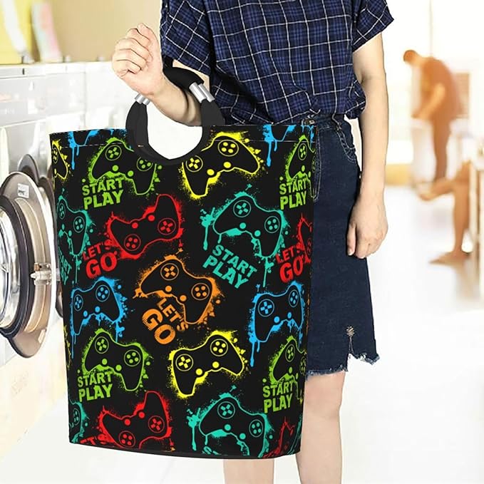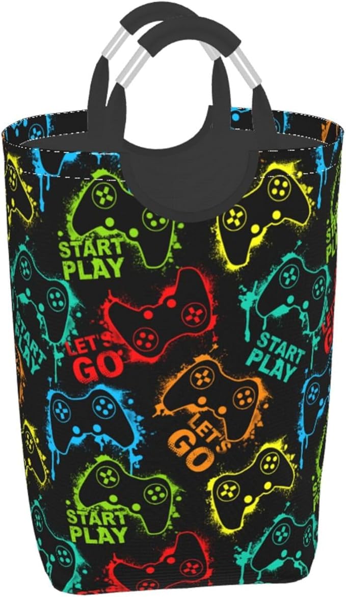 Game Theme Large Laundry Hamper Bag With Waterproof Liner - Gaming Joystick Silhouettes Laundry Basket Foldable Clothes Storage Organizer For Bathroom Bedroom Nursery Dorm