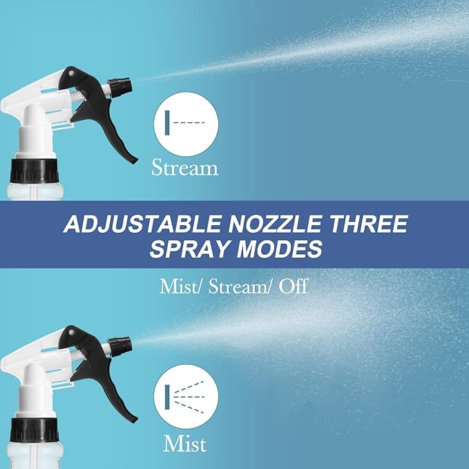 - Adjustable Spray Nozzle: heavy duty spray bottles feature adjustable nozzles, which have 3 different modes and can be rotated easily, allow you to switch from mist, stream or off; The outside can comfortably fit your hand and reduce hand fatigue, besides, the straw reaches the bottom of the bottle to avoid wasting and spraying each drop, bringing you a nice experience