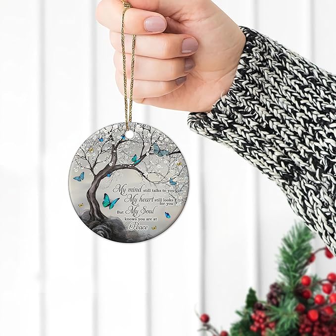 - Meaningful Memorial Gift: Features a heartfelt message "My mind still talks to you, My heart still looks for you, But My soul knows you are at peace", helping bring comfort and healing during times of grief. Elegant Tree & Butterfly Design: The serene artwork of a blossoming tree with butterflies represents eternal love, transformation, and remembrance.