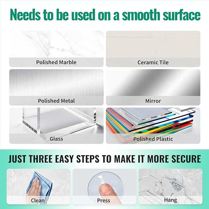 - 【Strong & Reliable Suction】 – Our heavy-duty suction cup shower caddy features ultra-strong suction technology, ensuring a secure hold on smooth surfaces like tiles, glass, and acrylic. No drilling, no damage—just a sturdy, wobble-free storage solution!