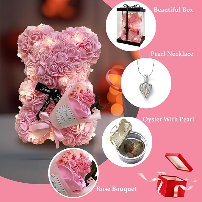 - 》Are you looking for gift for her? Here is perfect gift has a sense of ritual including Rose Teddy bear with lights and a pearl necklace mystery box. Each rose flower bear is a handmade combination of artificial roses that made by polyester and a foam bear. So you will get the unique one which is different from others. Give her a gift the unique Rose Bear Blind Box Pearl Necklace to show your sincerity and full love.