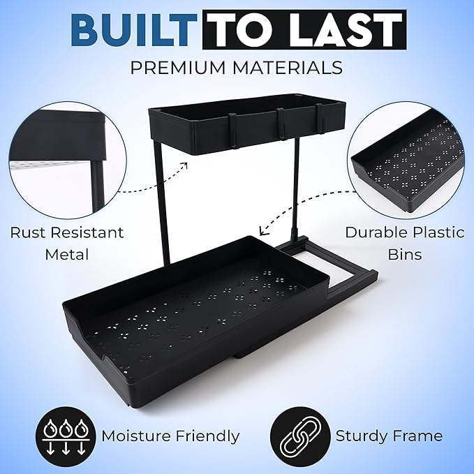 - L-Shaped Design: This Organizer is designed with an L-Shape, which allows you to insert under a kitchen or bathroom sink while leaving space for bottles and other items