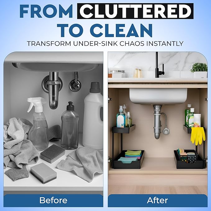 2-Pack Under Sink Organizer, 2-Tier Sliding Cabinet Storage, Under Sink Organizer with Hooks for Kitchen Bathroom Closet Pantry