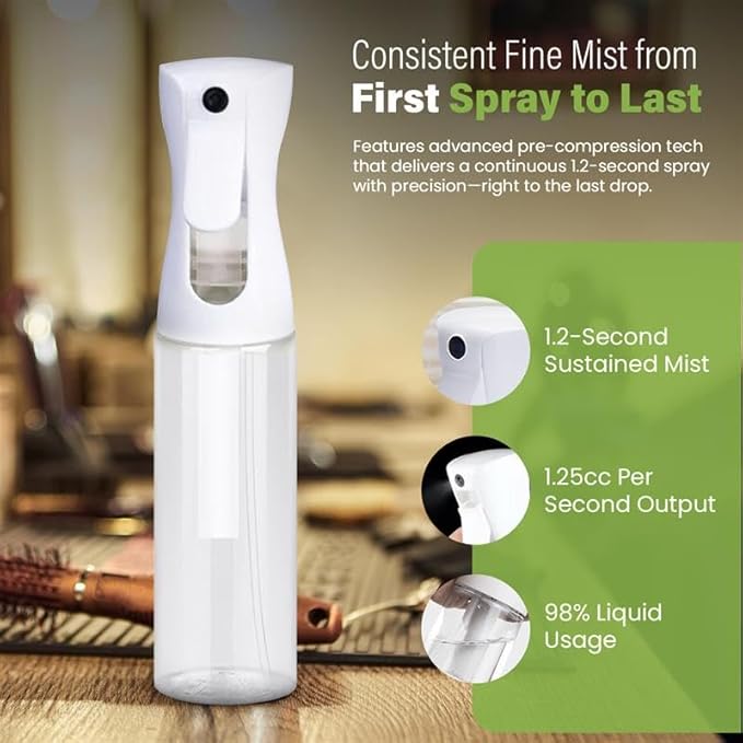 - 360° Fine Mist Sprayer: Easily reach every angle with our continuous spray bottle. Just a gentle squeeze releases a smooth, long-lasting mist—perfect for evenly coating hair, plants, or surfaces.