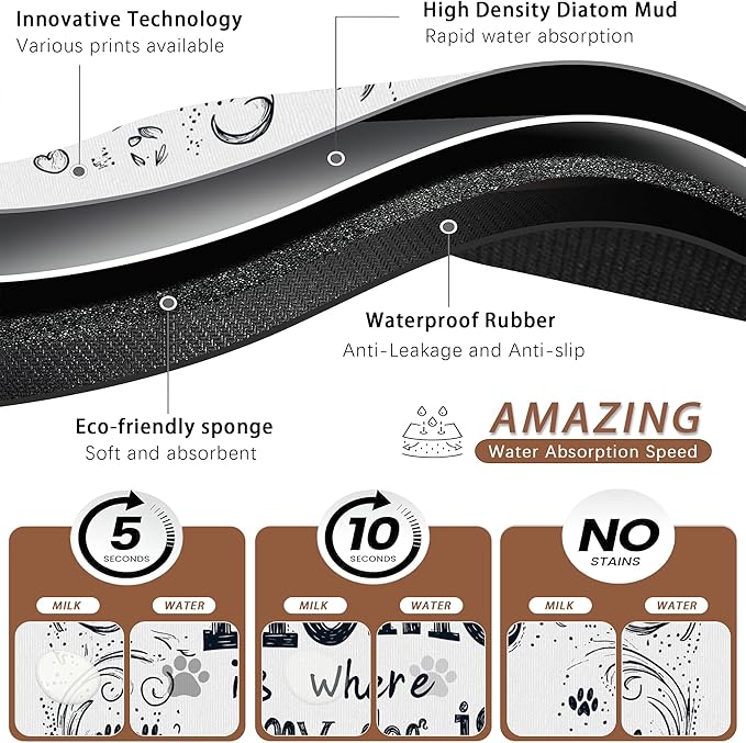 - Absorbent: This Home is Where My Dog is pattern pet food mat helps prevent liquid spills and keeps your pet's eating area clean, making it a practical addition to your pet supplies. It helps keep paws dry even for pets who love to drink water. The sturdy design is resistant to tearing and helps prevent accidental ingestion.