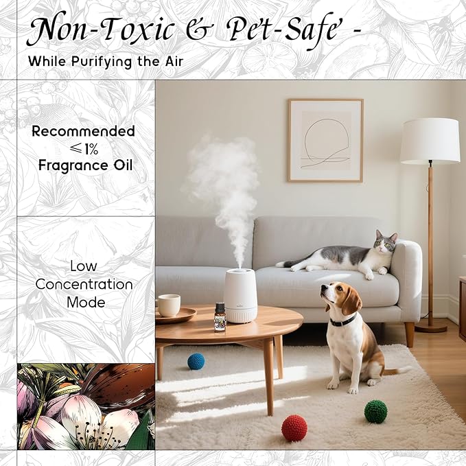 - Pet-Safe Formulation — We carefully crafted to exclude ingredients harmful to pets. Safe for use around pets in low-diffusion modes. It can also be diluted into sprays for pet beds or light DlY care