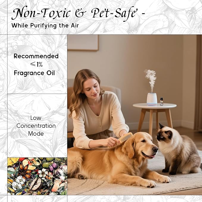 - Pet-Safe Formulation — We carefully crafted to exclude ingredients harmful to pets. Safe for use around pets in low-diffusion modes. It can also be diluted into sprays for pet beds or light DIY care