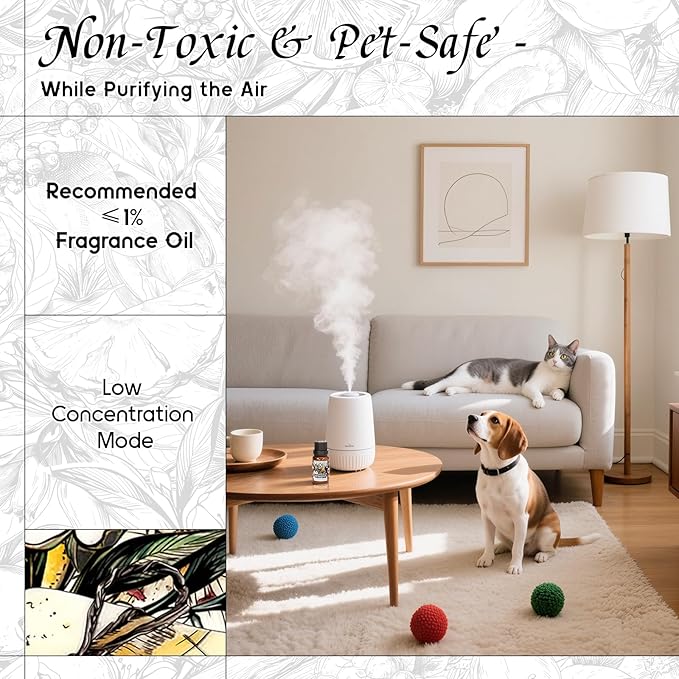 - Pet-Safe Formulation — We carefully crafted to exclude ingredients harmful to pets. Safe for use around pets in low-diffusion modes. It can also be diluted into sprays for pet beds or light DlY care