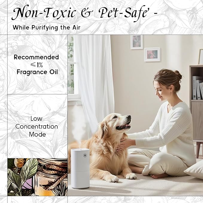 - Pet-Safe Formulation — We carefully crafted to exclude ingredients harmful to pets. Safe for use around pets in low-diffusion modes. It can also be diluted into sprays for pet beds or light DlY care