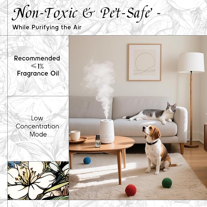 - Pet-Safe Formulation — We carefully crafted to exclude ingredients harmful to pets. Safe for use around pets in low-diffusion modes. It can also be diluted into sprays for pet beds or light DlY care