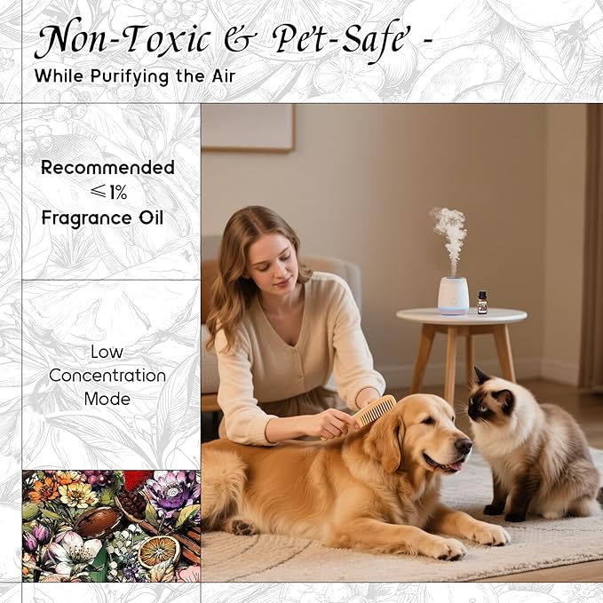 - Pet-Safe Formulation — We carefully crafted to exclude ingredients harmful to pets. Safe for use around pets in low-diffusion modes. It can also be diluted into sprays for pet beds or light DlY care