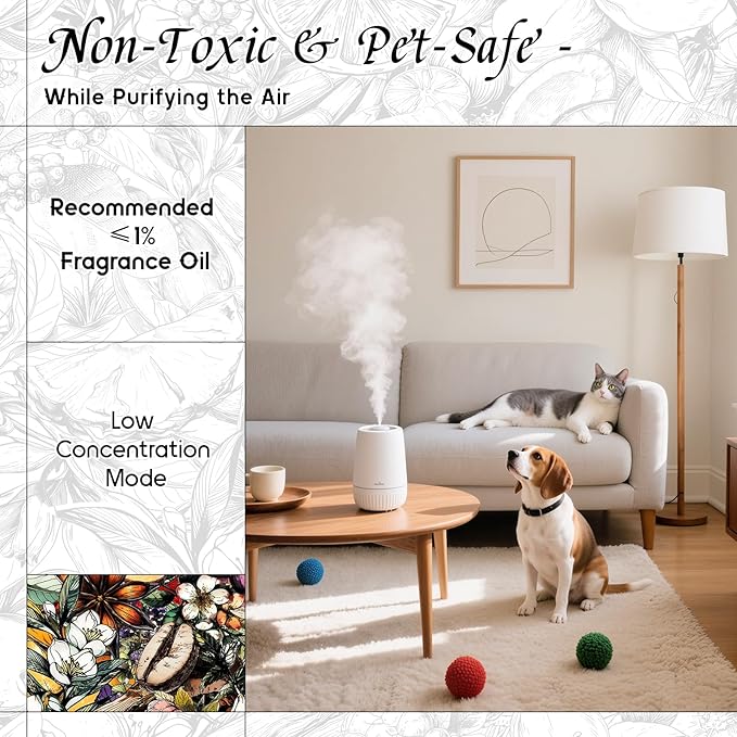 - Pet-Safe Formulation — We carefully crafted to exclude ingredients harmful to pets. Safe for use around pets in low-diffusion modes. It can also be diluted into sprays for pet beds or light DIY care