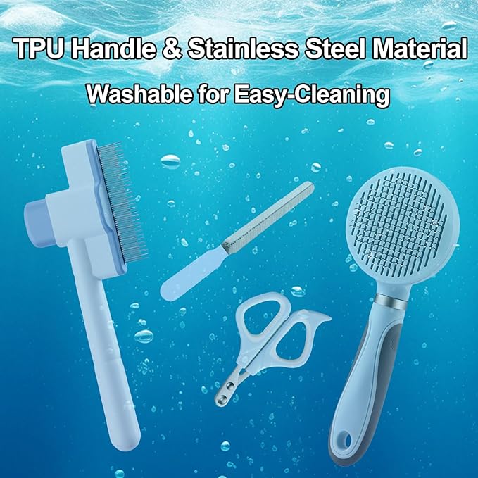 Cat Grooming Kit, 4-in-1 Cat Grooming Tools with Cats Brush, Flea Comb, Nail Clipper & Trimmer - Deshedding & Dematting for Pets Hair and Paws, Pet Shedding Set for Indoor Dogs & Cats (Blue)
