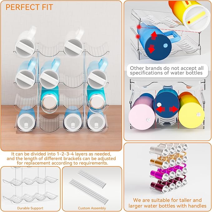 - 【Stackable Water Bottle Storage Rack】 Each layer of cup rack is independent and supported by sturdy metal pillars. You can freely stack it into 2 layers, 3 layers, 4 layers or higher, with a load-bearing capacity of 10LB per layer (the number of stackable layers depends on the number of layers you purchase)