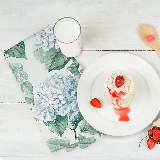 3 Pcs Blue Hydrangea Kitchen Towels, Farmhouse Blue Hydrangea Decor Summer Flowers Decorative Spring Floral Tea Dish Towels , Waffle Soft Hand Towel for Farmhouse Kitchen Bathroom, Housewarming Gifts
