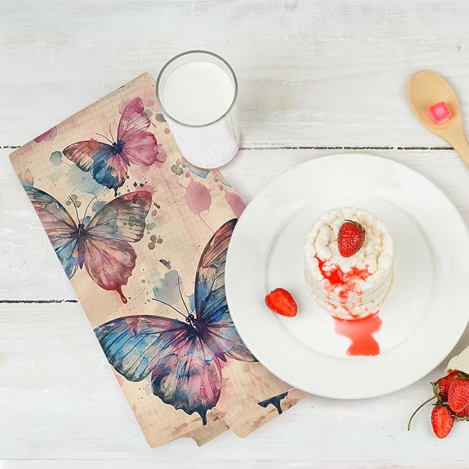 3 Pcs Vintage Butterfly Kitchen Towels, Rustic Decorative Absorbent Microfiber Dish Cloth Tea Towel, Artistic Waffle Soft Hand Towels for Farmhouse Home Bathroom, Butterfly Gifts
