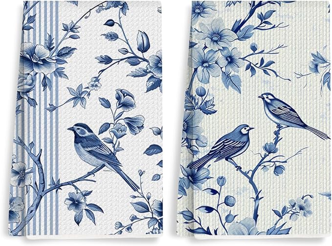 2 Pcs Artistic Bird Kitchen Towels, Floral Art Decorative Absorbent Microfiber Dish Cloth Tea Towel, Waffle Soft Hand Towels for Farmhouse Home Bathroom, Housewarming Gifts