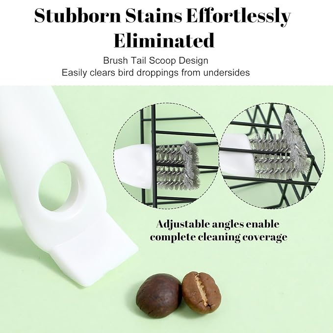 - 【Efficient Bird Cage Cleaner】Our birds cage cleaning features a dual-head design, combining stiff bristles and a sharp shovel to tackle both loose debris and hardened droppings. This perch cleaning brush ensures no residue is left behind, providing a spotless habitat for your feathered friends.