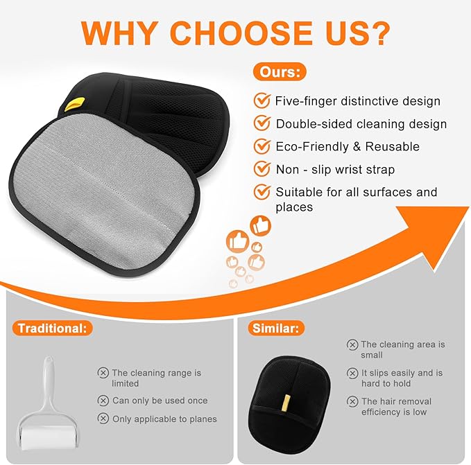 - Five-Finger Design: Our pet hair removal hand is a newly upgraded five-finger design that fits the hand perfectly. It comes with a flexible strap and lanyard design, which is both flexible and secure, greatly saving storage space