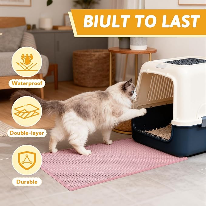 - Anti Tracking EZ Open Edge Litter Mat: Double-layer honeycomb design helps you gather the litter. You just pick up the mat and all the litter falls through and then dump it back in the litter box make it recycling. BEST MAT EVER! No more getting litter stuck to my feet on a daily basis! Large holes is large enough to catch and trap litter. Suitable for lots of type of litter, and kitty litter boxes,hooded,self cleaning litter box.