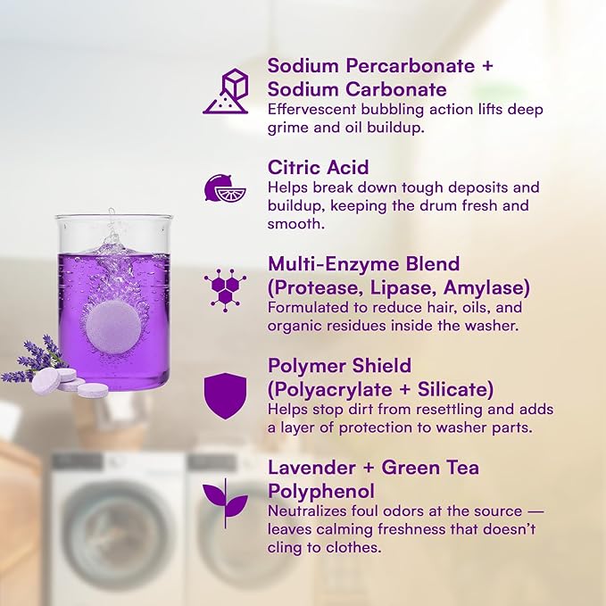 - Dual-Action Cleaner: Our washer machine cleaner tablets use oxygen-release fizzing agents to loosen soap and mineral deposits, while enzymes, lavender and tea extracts target pet grime and odor. Helps keep the washer fresh without harsh chemicals.