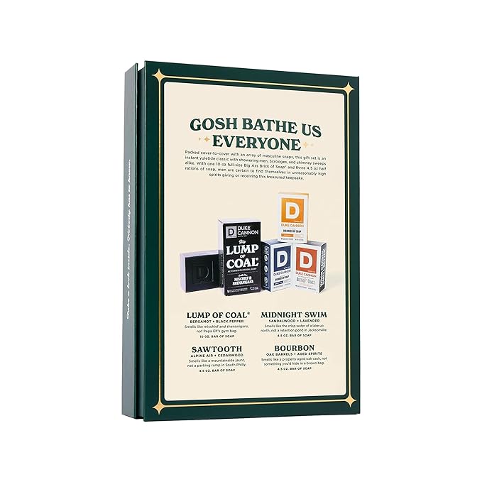 - Complete Holiday Soap Set for Men – Includes one full-size 10 oz Duke Cannon Lump of Coal bar and three junior bars in American Bourbon, Sawtooth, and Midnight Swim scents. Masculine, long-lasting, and made with premium ingredients—perfect Christmas, holiday, or stocking stuffer gift.