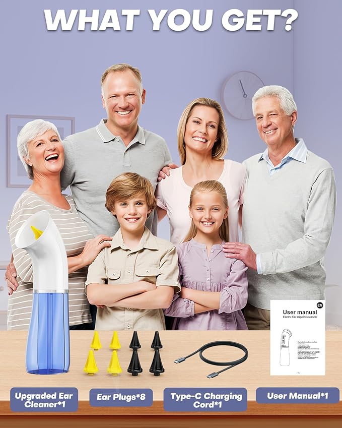 - 【Package Includes】1 × Ear Cleaner, 8 × Replaceable Nozzles, 1 × Type-C Charging Cable, 1 × User Manual. For best results, use warm water close to body temperature to avoid discomfort from extreme temperatures. Note: Do not use this product if you have an ear infection, a perforated eardrum, or any ear injury