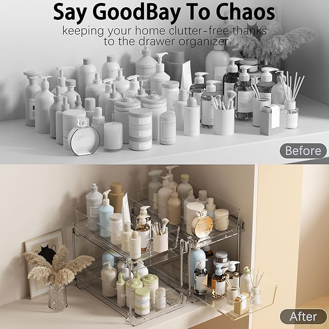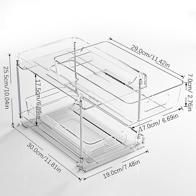 2 Tier Under Sink Organizer, 2 Pack Clear Bathroom Storage Vanity Counter Container, Cabinet Drawers Bins, Pull-Out Storage and Organization with Track for Pantry, Kitchen
