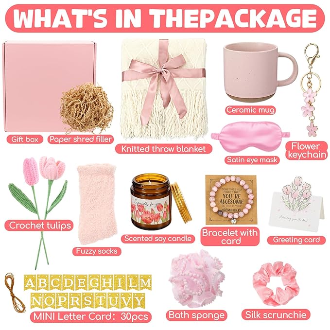 - Complete Pampering Gift Set: includes a soft knitted throw blanket, ceramic mug, scented soy candle, fuzzy socks, silk scrunchie, flower keychain, bath sponge, satin eye mask, greeting card, crochet tulips, mini banner, bracelet with card, and more, everything packed in a pink gift box