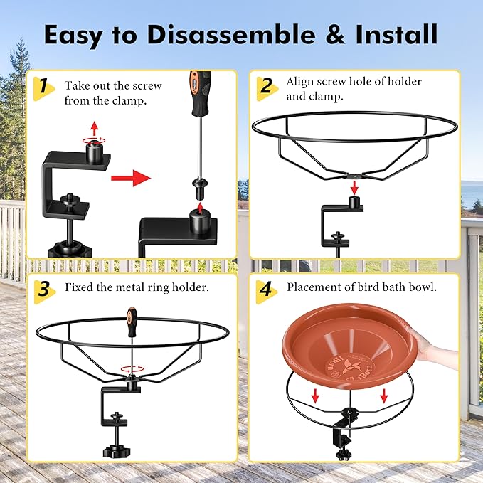 - [Do Not Include Solar Fountain Pump]:Please pay attention before purchasing, this deck mounted kit just include 12 inch bird bath bowl, 1 metal ring holder,1 clamp, Do not include any solar-powered fountain pump.