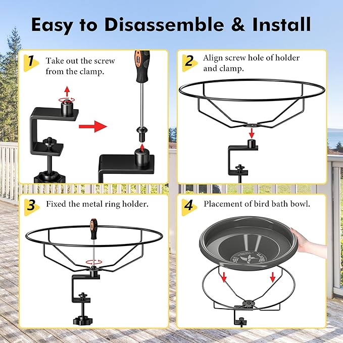 - [Do Not Include Solar Fountain Pump]:Please pay attention before purchasing, this deck mounted kit just include 12 inch bird bath bowl, 1 metal ring holder,1 clamp, Do not include any solar-powered fountain pump.